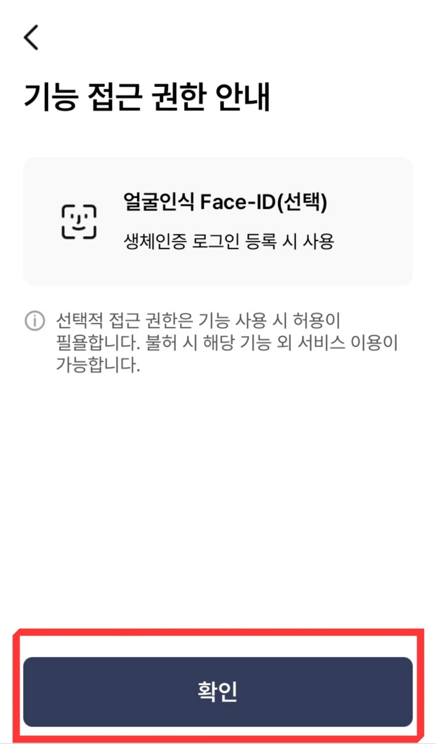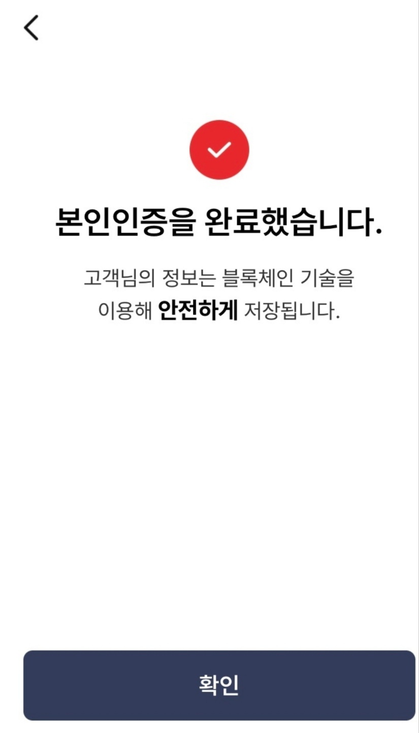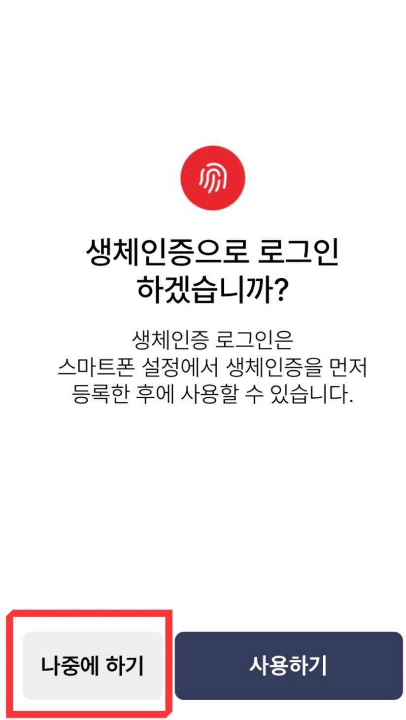6. 인증번호를 입력한 후 <인증확인>버튼을 누르시면 본인인증을 완료했다는 창이 뜹니다. 그럼 아래 <확인> 버튼을 누르시고 생체인증 로그인 여부를 묻는 질문에는 <나중에하기>를 누르셔서 진행하세요. 아니면 다시 재로그인 하면서 처음부터 다시 시작해야합니다.