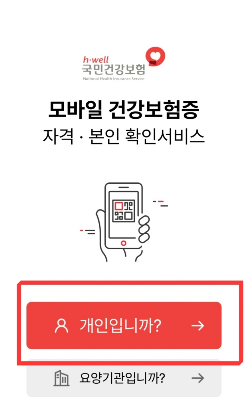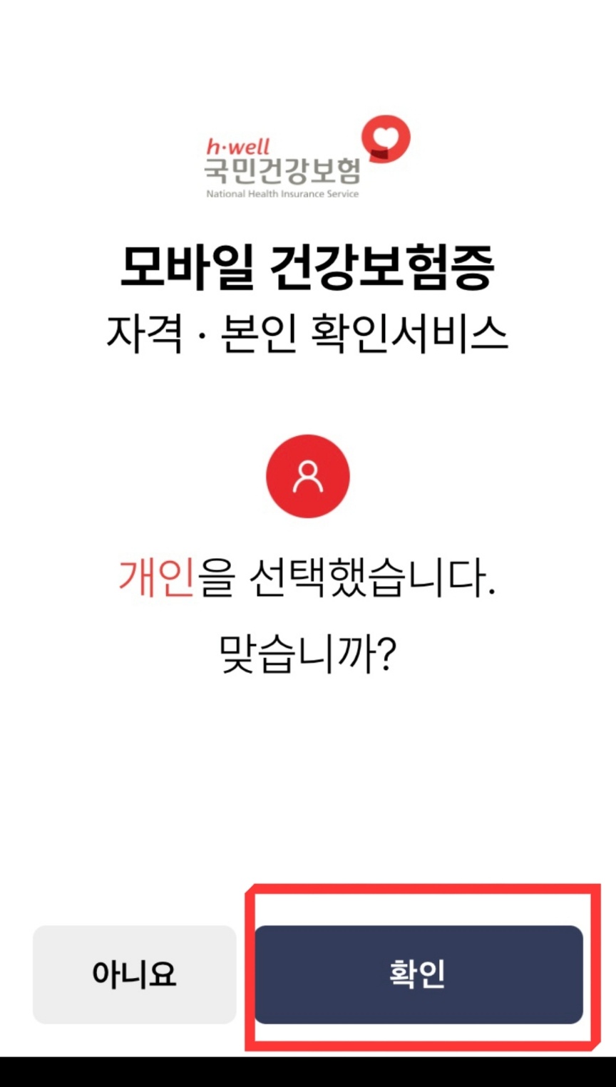 1. 휴대폰 앱 스토어에 들어가서 '모바일 건강보험증'을 내 휴대폰에 다운받습니다. '개인입니까?'를 선택한 후 개인이 맞는지에 대한 물음에 <확인> 버튼을 누릅니다.