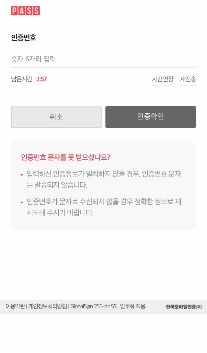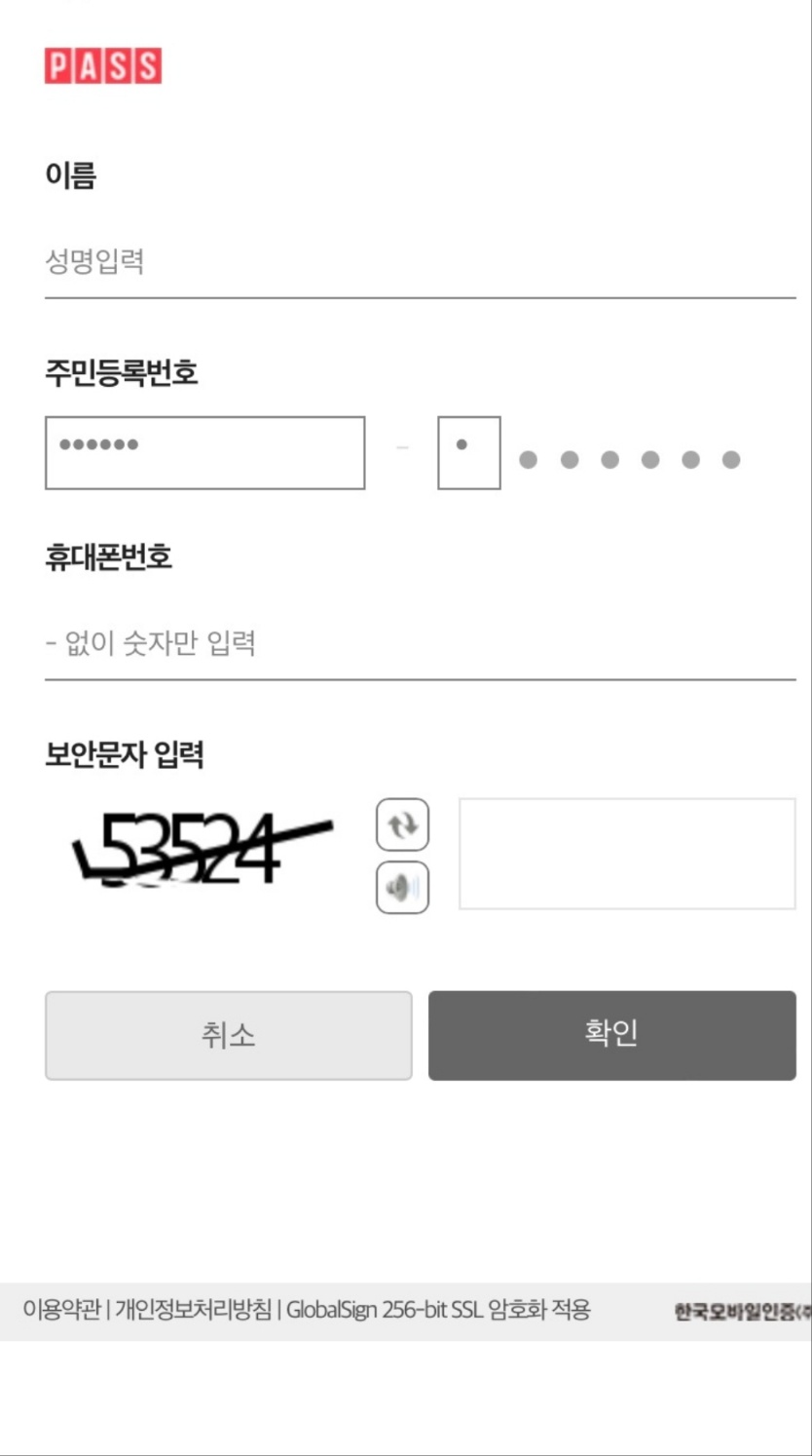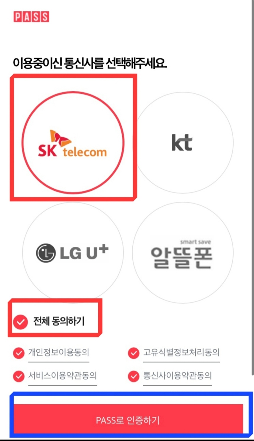 *PASS앱이 없으신 분은 통신사 선택 후 '문자로 인증하기'를 선택하셔서 인증하시면 됩니다.