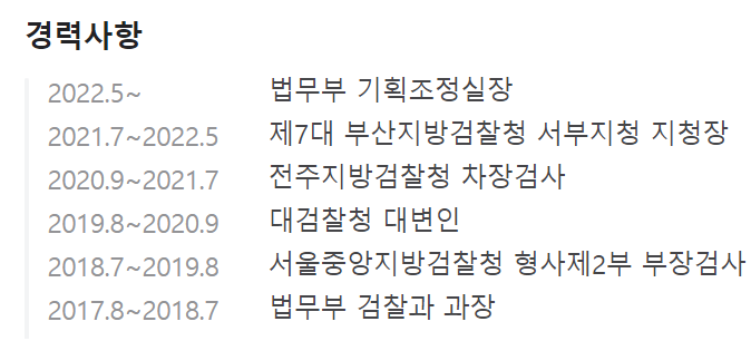 권순정 검사의 경력사항입니다. 2017년 법무부 검찰과 과장, 18년 서울중앙지방검찰청 형사제2부 부장검사, 19년 대검찰청 대변인, 20년 전주지방검찰청 차장검사, 21년 7대 부산지방검찰청 서부지청 지청장, 22년~현재까지 법무부 기획조정실장을 맡고 있습니다.