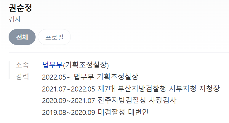 권순정 검사의 프로필 보시겠습니다. 2019년 대검찰정 대변인, 20년 전주지방검찰청 차장검사, 21년 7대 부산지방검찰청 서부지청 지청장, 22년~현재까지 법무부 기획조정실장을 맡고 있습니다.