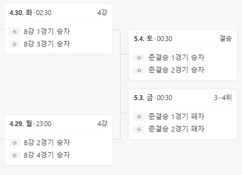 아래는 8강, 4강전 시나리오 대진표 입니다. 조별리그 이후 조 순위가 정해지고 토너먼트가 진행됩니다. 우리나라는 조 3위가 되면 본선 직행 티켓을 손에 쥘 수 있습니다.