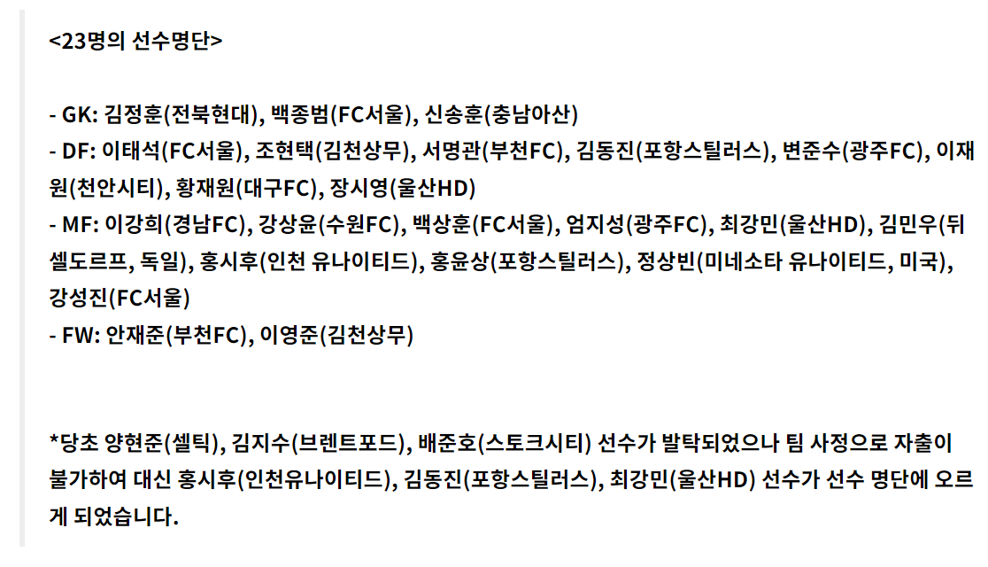 u-23 대표팀 선수 선발 명단입니다.