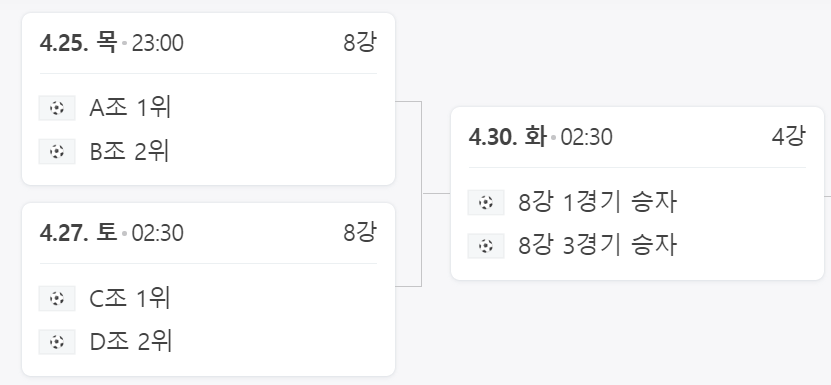 8강전은 4월 25일(목) ~ 27일(토)까지 경기가 진행됩니다. 4강전은 4월 29일(월) ~ 30일(화) 진행됩니다.