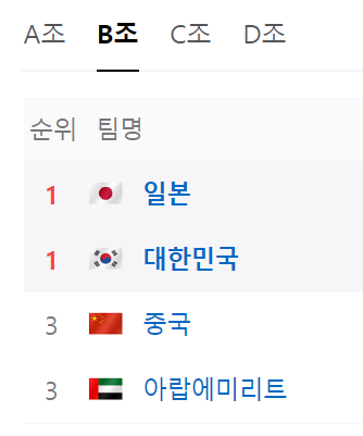 - B조: 일본, 대한민국, 중국, 아랍에미리트(UAE)
